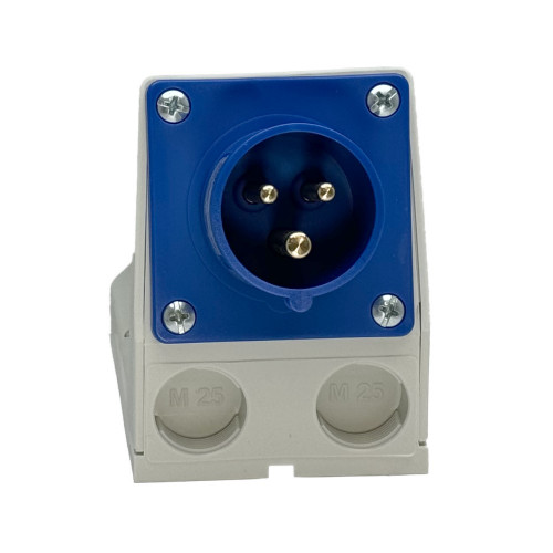 CEE opbouw wandcontactdoos (male) Merk: ABL Kleur: Blauw Aantal polen: 3 Kabelinvoer: Zelfdichtende tule, M25 IP waarde: IP44 spatwaterdicht Nominale stroom: 16 Ampere Nominale spanning: 230 Volt AC Klokuur positie: 6 uur