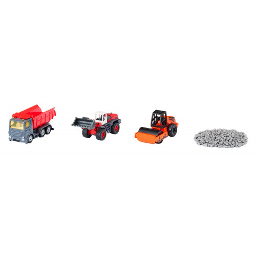 Siku wegenbouwset. Bestaande uit vrachtwagen met kiepbak, shovel rood/wit en asfaltwalser oranje + los grind.