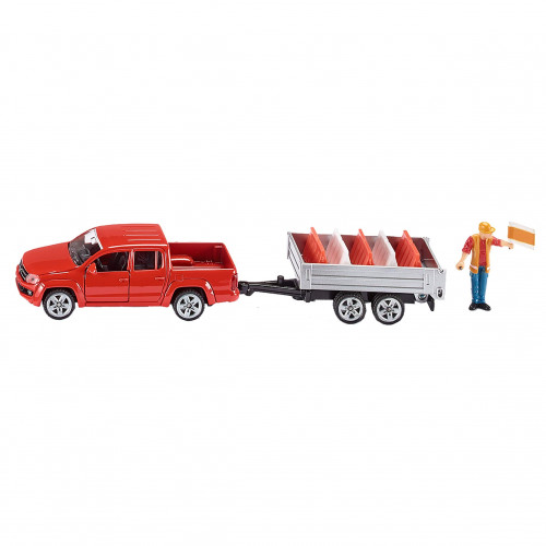 Siku VW Amarok pick-up met kiepaanhanger en accessoires.