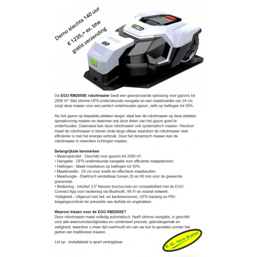 De EGO RM2000E robotmaaier biedt een geavanceerde oplossing voor gazons tot 2000m². Met slimme GPS-ondersteunde navigatie en een maaibreedte van 24cm zorgt deze maaier voor een perfect onderhouden gazon, zelfs op hellingen tot       50%.